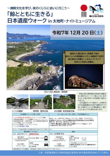 熊野灘捕鯨文化継承協議会では、日本遺産ガイドの案内で太地町内の日本遺産構成文化財や捕鯨文化ゆかりの地、営業終了後の太地町立くじらの博物館など、鯨とともに歩んできた歴史や文化等を巡るウォークイベントを開催します。