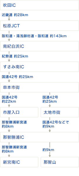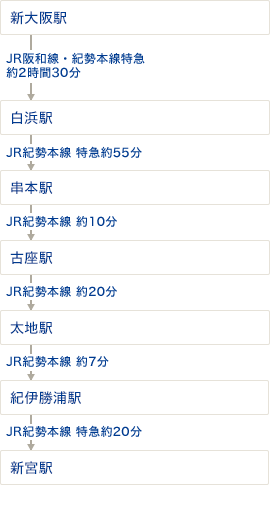 鉄道利用の場合は、新宮・紀伊勝浦・太地・古座・串本で下車。いずれもJR特急の停車駅となっている。