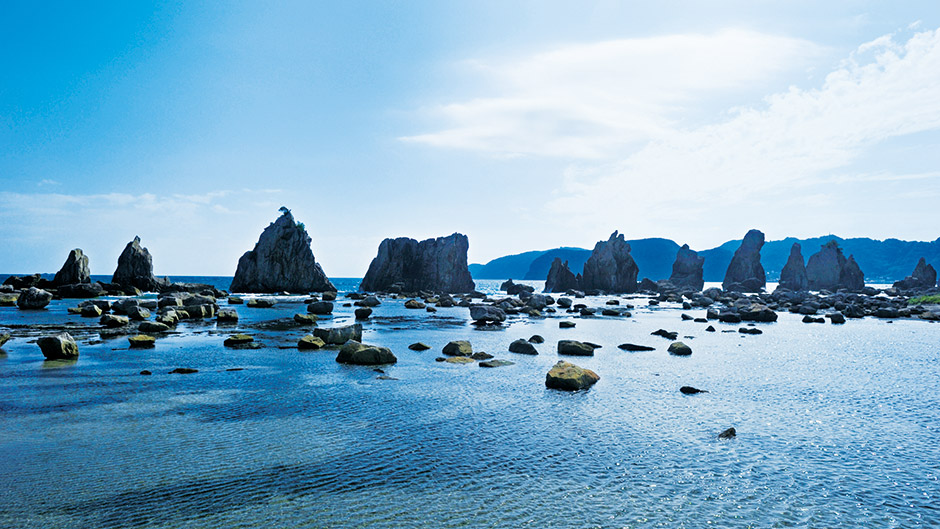 最初に訪ねる橋杭岩は、和歌山県を代表する景勝地。青い海に大小40余の岩柱が並び立ち、潮の満ち引きや太陽の位置によって、1日のうちでもさまざまな美しさを見せる。