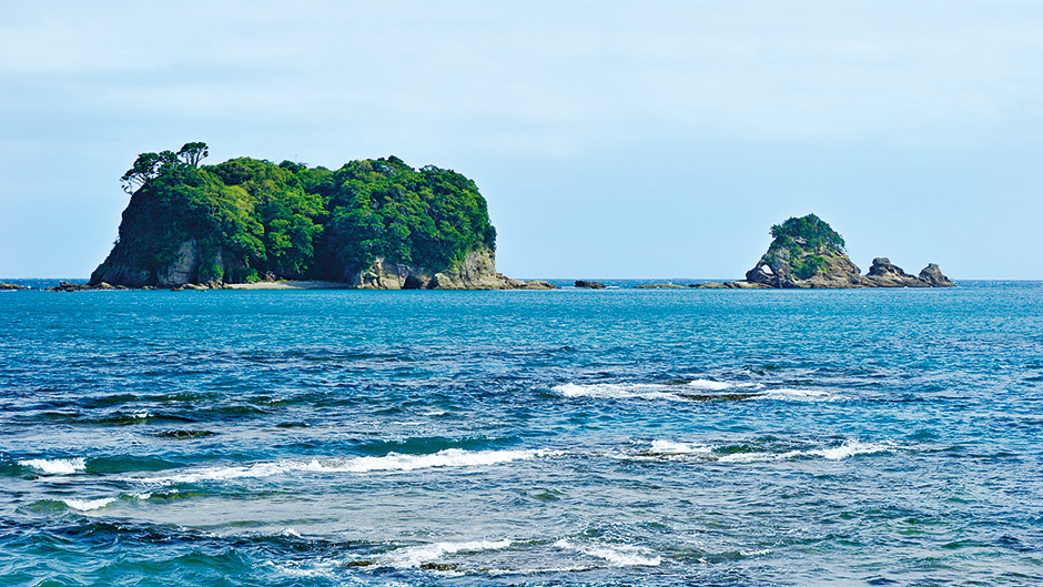 橋杭岩から国道42号を新宮方面に進んで行くと、右手の熊野灘に九龍島・鯛島が見えてくる。古座川河口の沖、約1㎞に浮かぶ無人島で、かつては熊野水軍の拠点だったと伝わっている。また、大きい方の九龍島は、熊野灘の捕鯨文化のひとつ「河内祭の御舟行事」にも関係する聖地として崇められている。鯛島はその名の通り、鯛のような形が目を引く。