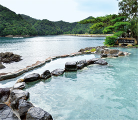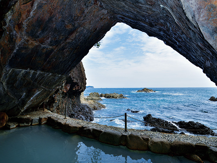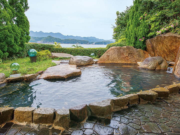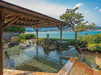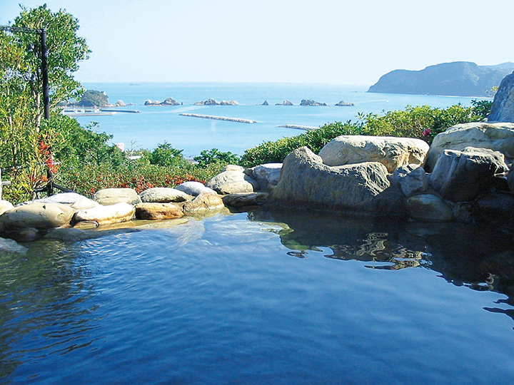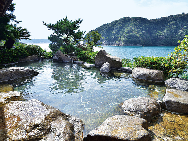 勝浦の町から少し離れた、入江の奥の静かな場所に立つ。露天風呂「汐見の湯」、ミニ水族館がある大浴場ともに、敷地内から湧き出る源泉をぜいたくにかけ流し。アルカリ性の湯は肌になめらかで、美肌効果も期待できるという。